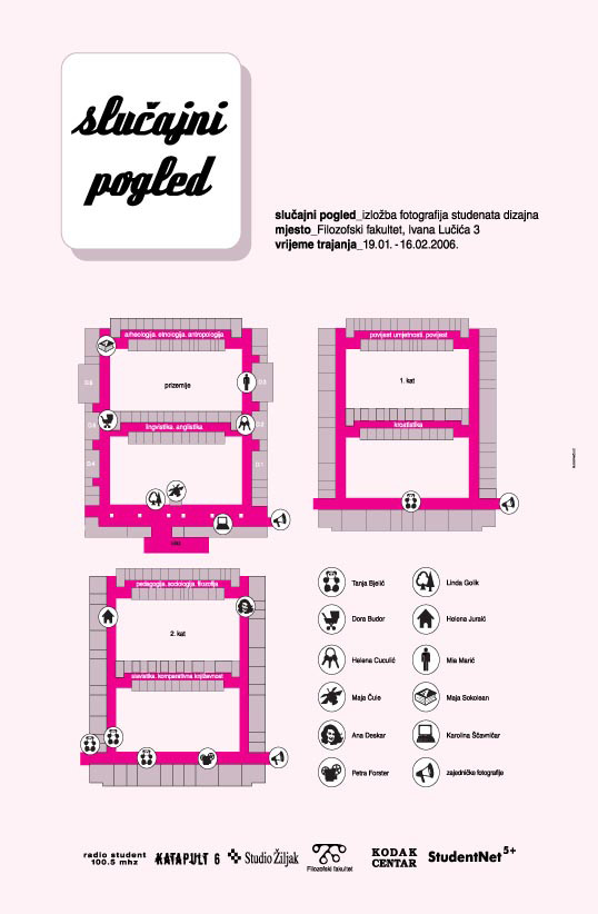 U četvrtak, 19. siječnja 2006. u auli Filozofskog fakulteta u Zagrebu, Ivana Lucića 3 otvorena je izložba "Slučajni pogled". Nastavak je to projekta udruge mladih kustosa Katapult 6 kojoj je cilj katapultirati mlade autore u sferu, njima često nedostupne, umjetničke scene. Udruga Katapult 6 započela je djelovanje u Foto-galeriji KIC koju su vodili kroz cijelu 2005. godinu. Njih 6 bili su tada studenti koje je okupila želja za radom, a sada već polako postju pravi kustosi koji žele raditi s mladim, često neafirmiranim autorima. U objavi za medije kažu: nastavljamo započeti niz izložbi fotografija koje, i ovog puta, stavljamo izvan konteksta "muzejskog" prostora intervenirajući u javni prostor – prostor Filozofskog fakulteta. Filozofski fakultet nije samo mjesto izlaganja, već i nastanka svih fotografija: jedanaest studentica dizajna pri Arhitektonskom fakultetu imale su zadatak istražiti prostor "njima nepoznatog fakulteta, njegove svakodnevne